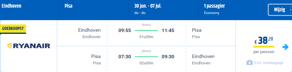 Je kunt eind juli al naar Pisa vliegen voor slechts €38 per retourticket. Je vliegt dan in de economy class vanaf Eindhoven met de luchtvaartmaatschappij Ryanair. De prijs is inclusief 1 stuk handbagage van maximaal 10 kg en één kleine accessoire.